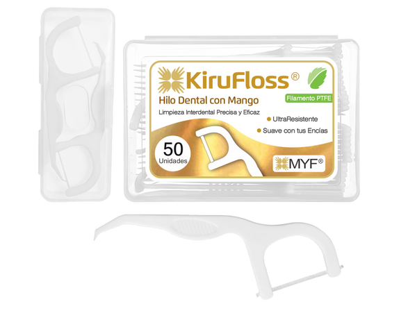 KiruFloss® Es un práctico Hilo de PTFE (Teflon) Supersuave Ultrafino con mango de facil agarre, indicado para todo tipo de dientes, especialmente con espacios estrechos y encías sensibles.